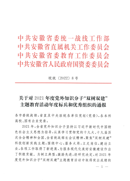 近日,安徽省委统战部、省直机关工委、省委教育工委和省国资委党委等四部门联合发文,对2021年度安徽省党外知识分子“双树双建”活动年度标兵和优秀组织进行通报表彰,我校欧美同学会副会长、九三学社基层委员会副主委、85Tube