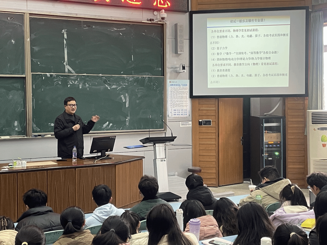 在1号教学楼报告厅举行2025届物理学就业前置教育暨考研择校指导会。物理学(师范)专业负责人吕建平教授、全体2025届物理学拔尖人才班、物理学师范班以及全体辅导员参加会议。