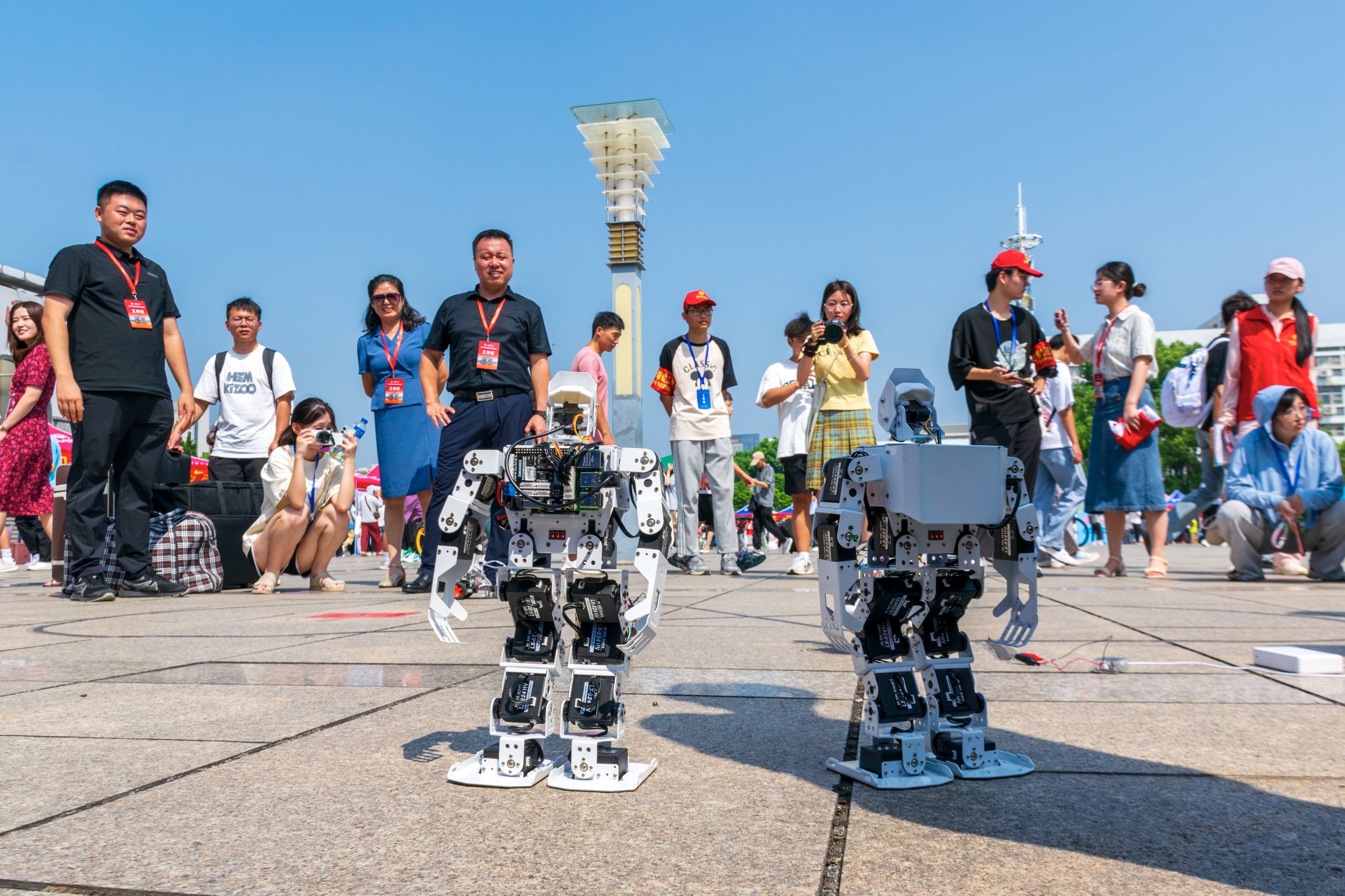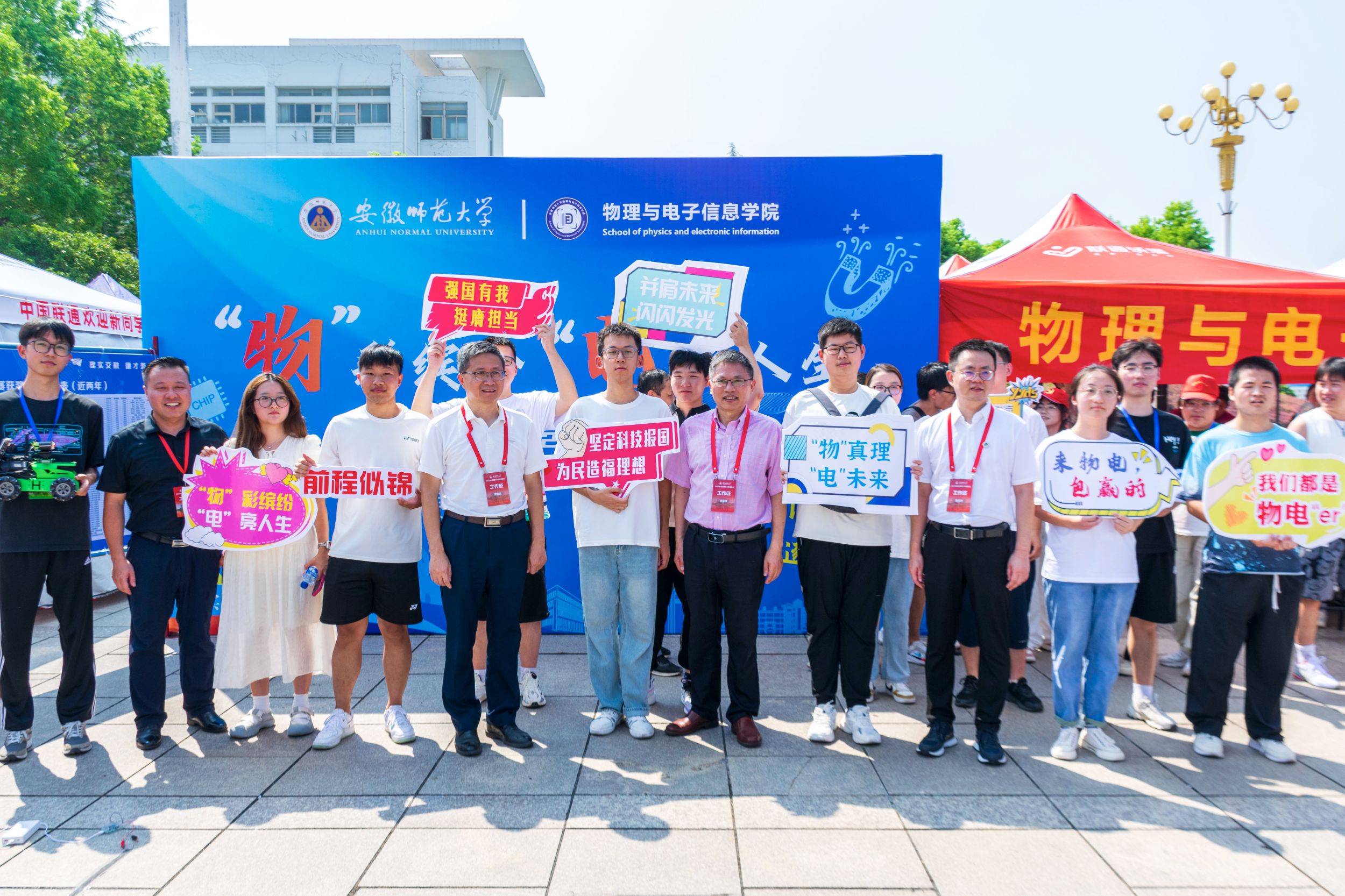 迎新现场,学术科技作品展台上展示着物电学子制作的科技作品,从工科学生研制的能歌善舞的机器人、风驰电掣的智能汽车、5G远程驾驶智能车到物理师范生自制的磁感应强度探究仪、法拉第电磁感应定律演示仪、光的折射探究仪等物理教具,通过学生志愿者专业演示与讲解,让新生们在展览中感受学科魅力,对自己所学专业有了进一步的认识。此外,学院学团组织简介、育人品牌项目、2024届考研光荣榜、学科竞赛光荣榜等宣传内容也在潜移默化中让专业思想教育加深加固。
