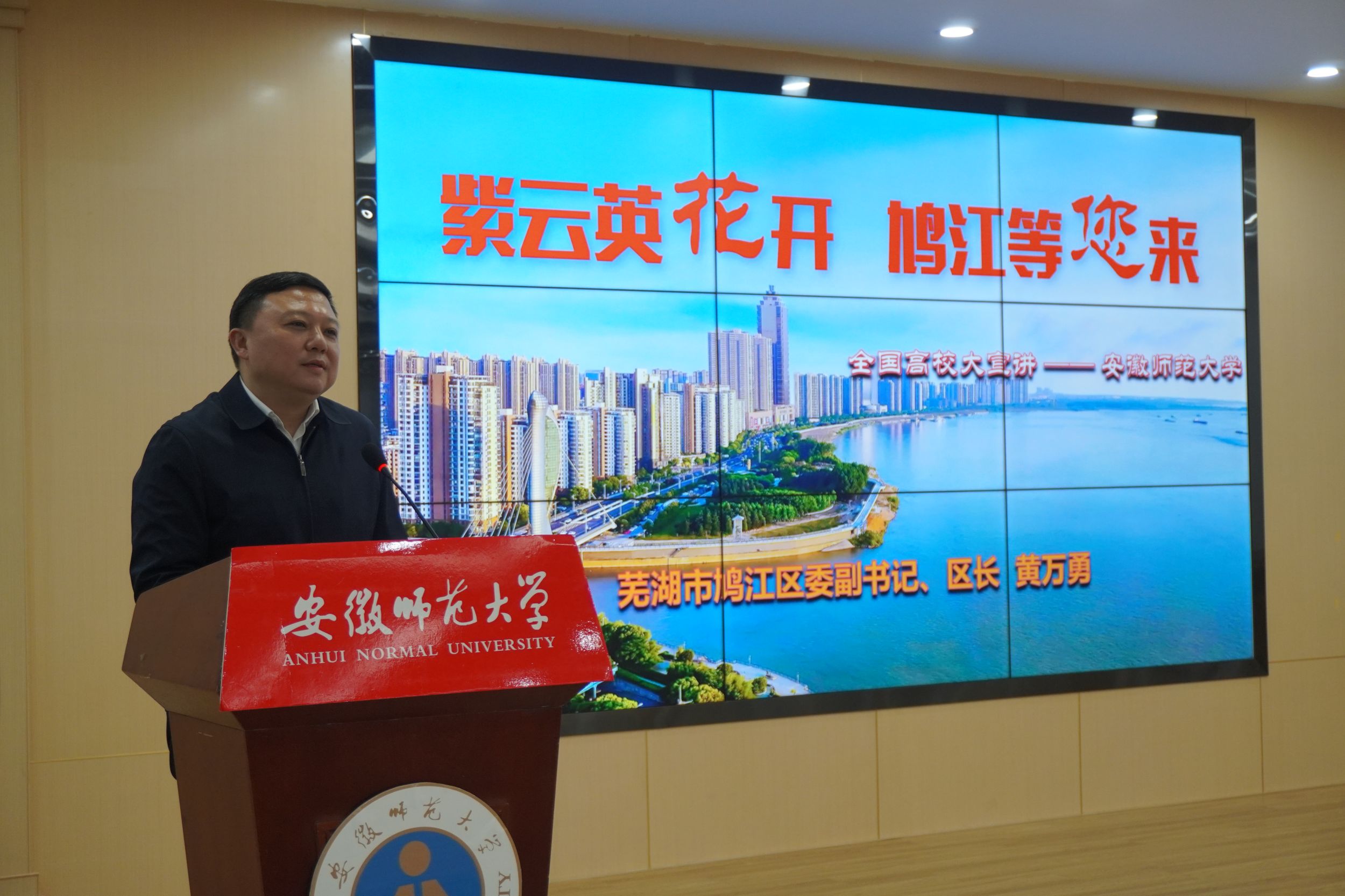 活动伊始,“紫云英花开,鸠江等您来”专场宣讲会率先启动。鸠江区委副书记、区长黄万勇率副区长魏利胜、区人才工作局局长苏晨等政府代表出席,安徽师范大学招生就业处副处长刘振杰代表校方向鸠江区政府一行致欢迎辞。刘振杰表示,学校始终将服务地方发展作为使命,近年来通过深化校地合作,已为鸠江区输送大批高素质人才,“此次招聘会既是合作成果的体现,更是未来共赢的新起点”。 黄万勇区长随后围绕鸠江区产业布局、人才政策和发展机遇展开区情推介。他提到,鸠江区正全力打造新能源、微电子、智能装备三大产业集群,并通过“紫云英人才计划”为毕业生提供购房补贴、创业扶持等政策,“我们以最大诚意邀请青年学子扎根鸠江,与城市共成长”。