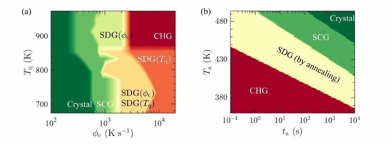 图1. 金基非晶合金的熔体温度-冷却速率和退火温度-退火时间调控工艺相图。