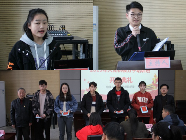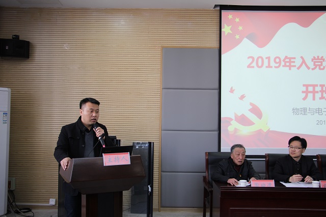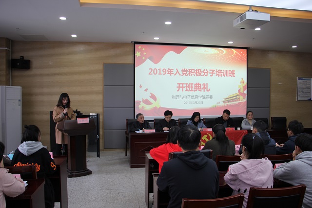 分党校2019年上半年入党积极分子培训班开班典礼在理化大楼304会议室召开。校党委组织部副部长、校党校常务副校长谢超峰老师,院党委书记、分党校校长李娟老师,院党委副书记、分党校副校长黄友生老师,院关工委副主任、分党校指导老师陶绪德老师,院组织员、党委秘书王梦晓老师参加开班式。开班典礼由培训班班主任李琦琦主持。