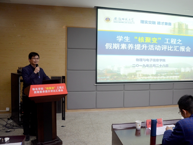 在304报告厅隆重举行学生“核聚变”工程之假期素养提升评比展示活动。教务处副处长崔光磊、校团委副书记刘长生、教学副院长许新胜、院党委副书记黄友生、通信专业负责人张爱清、专业教师周正仙担任评委,全体专兼职辅导员、各年级学生代表组成大众评审团,共同参加了活动。评审汇报会由学院团委副书记胡皖蓉主持。