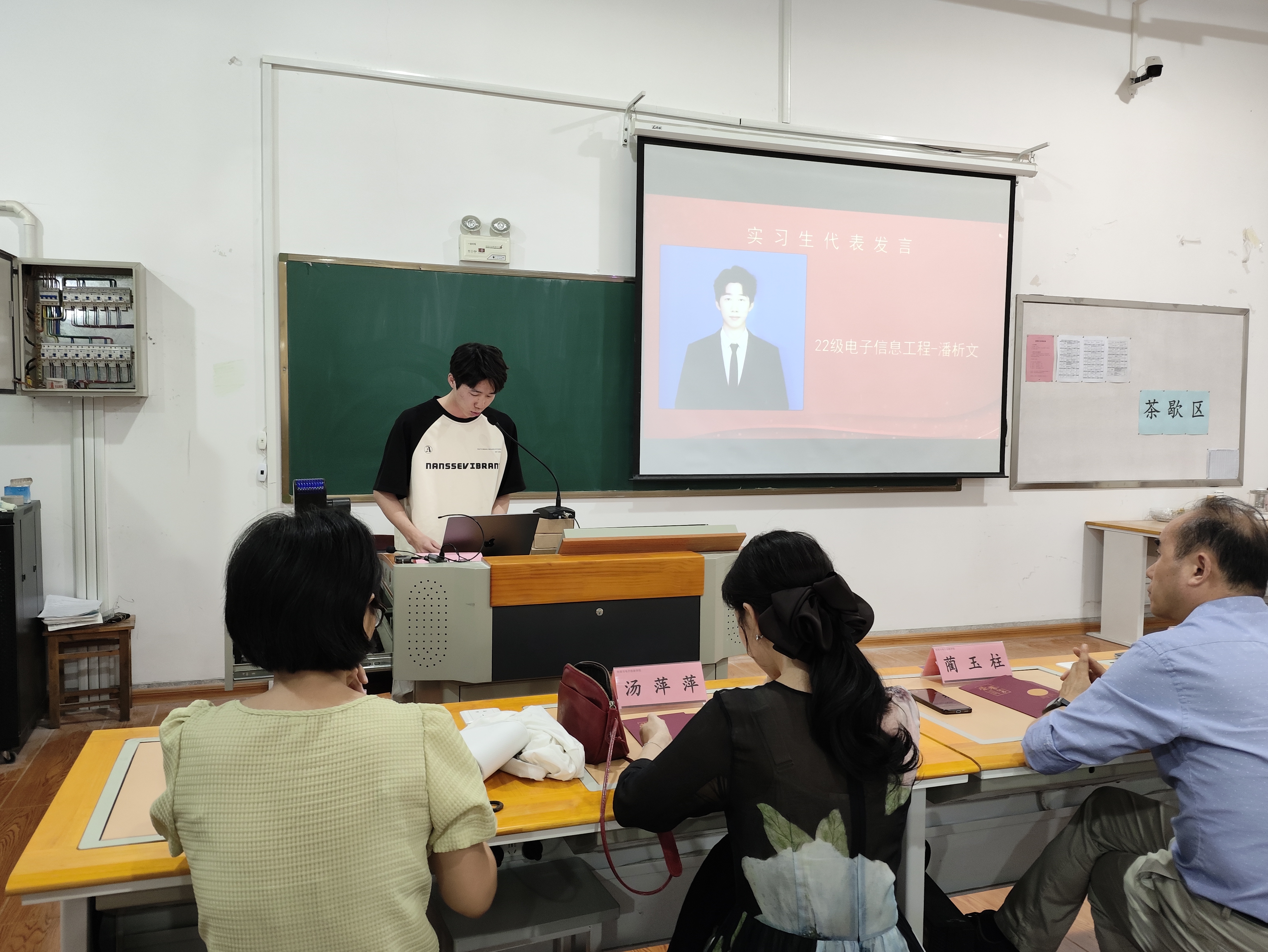 随后,优秀实习生代表汇报实践心得。22级电子信息工程专业潘析文结合自身经历,畅谈如何将课堂理论转化为解决实际工程问题的能力,强调实践对专业认知的深化作用。23级通信工程专业柏宇乐则分享了初次接触FPGA项目的挑战与收获,直言这是一次系统性的深度学习经历,它不仅提升了自身的专业技能,更建立了硬件工程思维,成功架起了理论知识通往实践的桥梁。