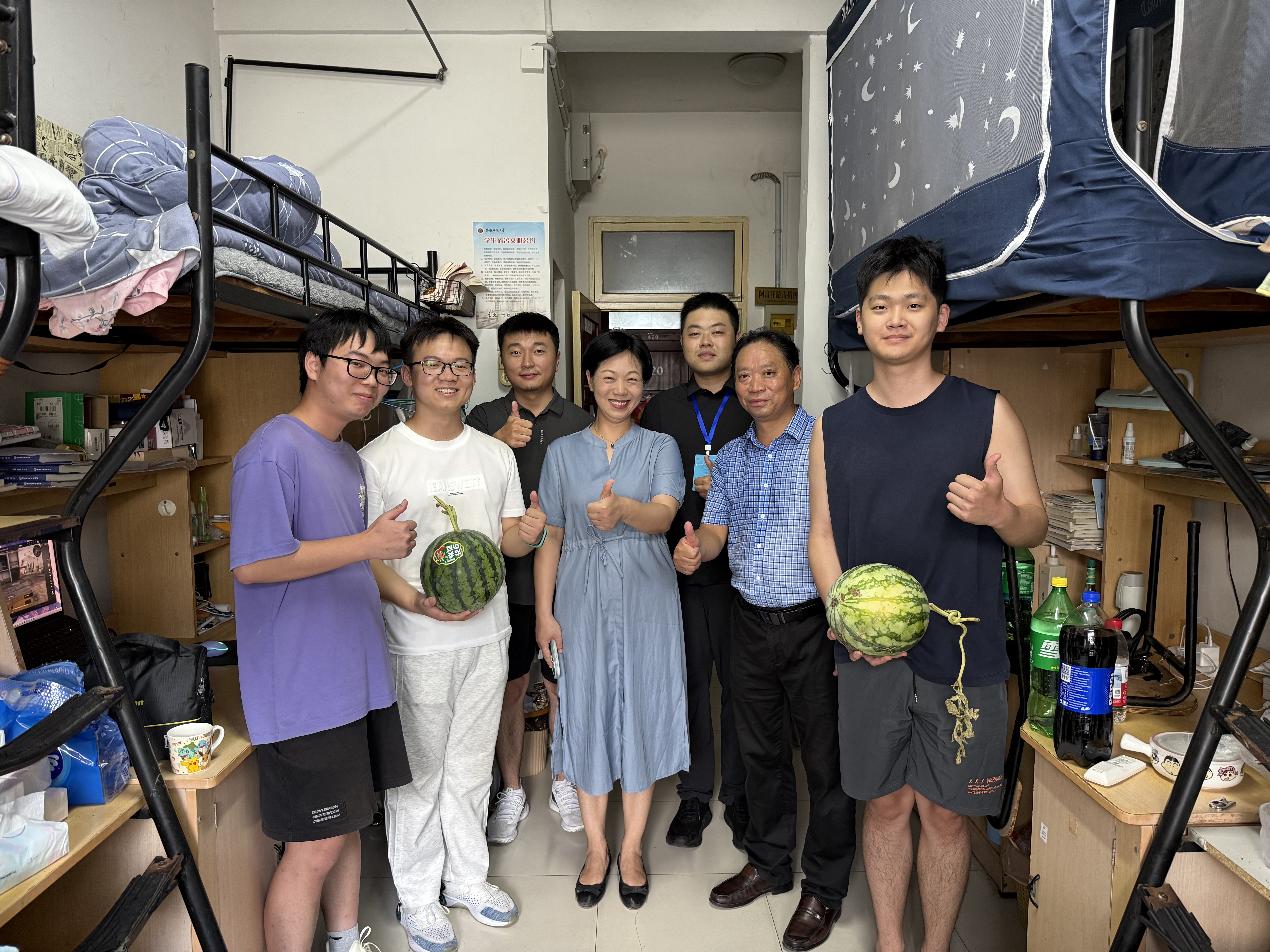 暖心慰问,助力考研征程。8月5日下午学院党委书记宋静、副院长张其芳带领2026届毕业生辅导员深入学生宿舍,与同学们展开亲切交流,详细了解同学们的复习进度、生活需求,宋静充分肯定了同学们不畏酷暑、迎难而上、挑战自我、积极进取的精神,勉励大家在劳逸结合中持续发力,以恒心和信心坚持到底,学院将全力为大家提供支持。张其芳提醒同学们注意防暑降温,保持积极心态。学院还为留校学生发放了西瓜、饮料等消暑慰问品,让学子们在炎炎夏日感受到暖心关怀。
