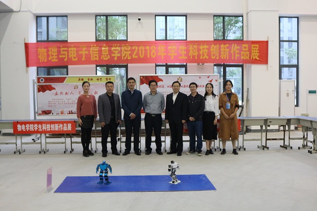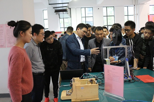 在实训中心一楼举办2018年学生科技创新作品展。教务处处长、创新创业教育学院院长周端明,科研处副处长王朝辉,院长郑贤锋,院党委副书记黄友生,专业教师刘小明、陶文海亲临现场参观指导。