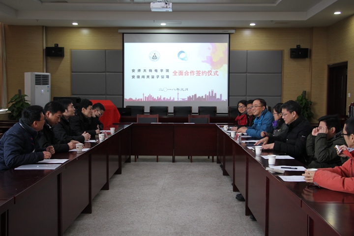 李娟首先代表学院向问天量子公司刘云一行表示热烈欢迎,并简要介绍了学校和学院的基本情况。吴长义介绍了校区近三年来在就业、人才培养、联合申报和建设《安徽省量子安全工程研究中心》、合作开展科技攻关项目等情况,双方合作不断深入,以结出硕果。刘云介绍安徽问天量子科技股份有限公司的基本情况和发展目标,高度评价了学院人才培养质量和科研水平,希望通过此次签订全面合作协议,深化推进校企协同育人和科技发展。与会人员就项目合作进行了深入交流。签署校企产学研与就业全面协议,为共建获批的安徽省《安徽省量子安全工程研究中心》揭牌,签约结束后,进行了企业捐赠仪器交接,走访了参观了光电工程中心和工科实训中心。