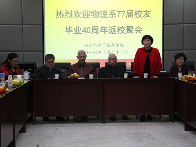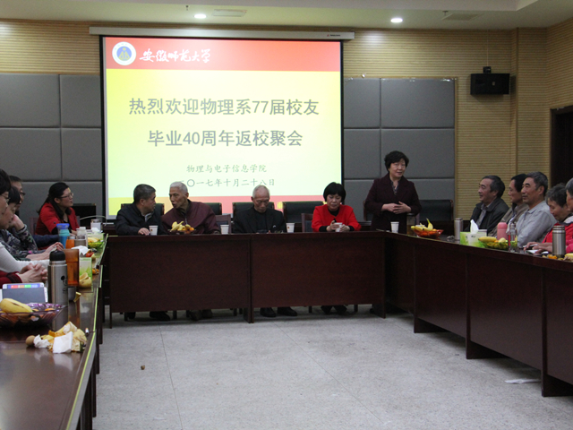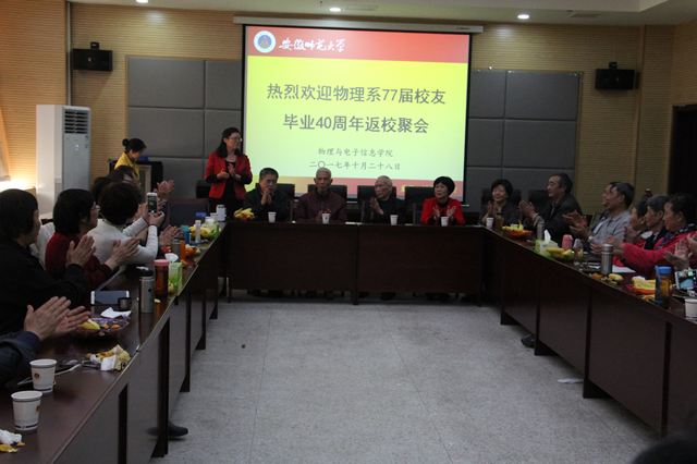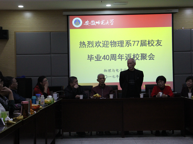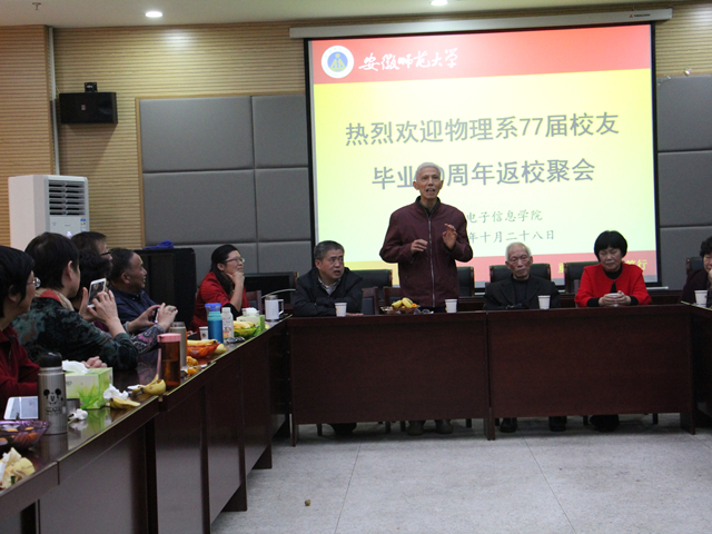 77届物理系30多名校友在阔别母校40年后,重返母校,相聚芜湖。校友们特别邀请学院领导班子及部分时任老师参加了此次聚会活动,活动由叶松庆校友主持。