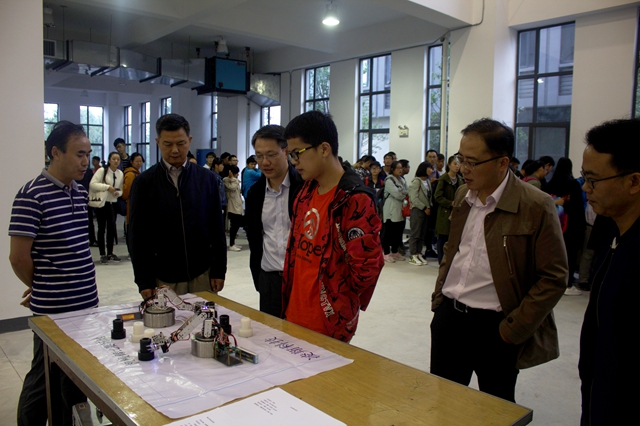 下午一点开始,实训中心的所有展出作品早已就位,同学们依次参观。在蔺玉柱老师和各作品制作人仔细讲解下,各位老师和学生听的十分认真,对作品大为称赞,并对现场的作品展示报以热烈的掌声。