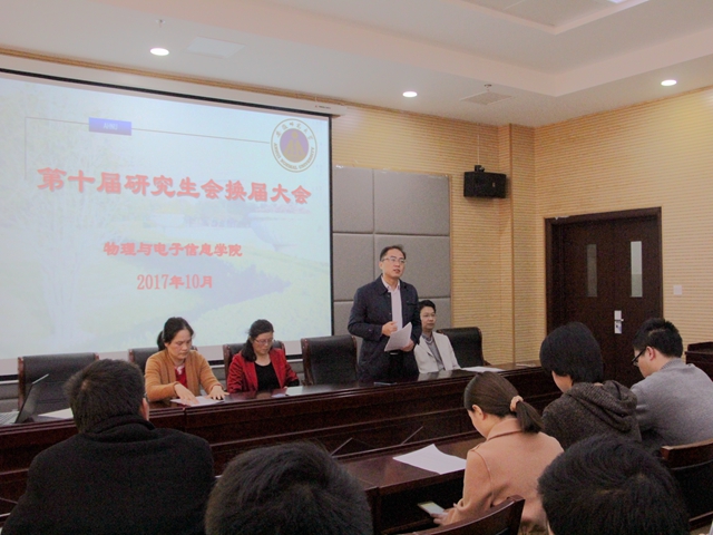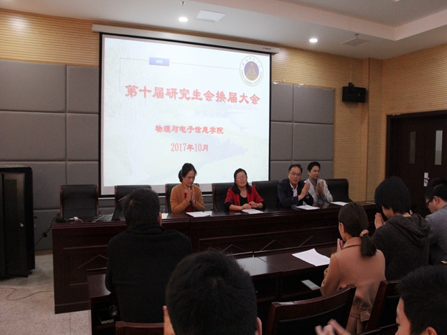 第十届研究生会换届大会在物理大楼333会议室成功举办。学院党委书记、思想政治工作领导组组长李娟,院党委副书记吴长义、研究生秘书王亚青、2016级研究生辅导员张法保老师应邀出席了本次大会,学院研究生会第九届、第十届全体成员参加了会议。大会由研究生秘书王亚青老师主持。