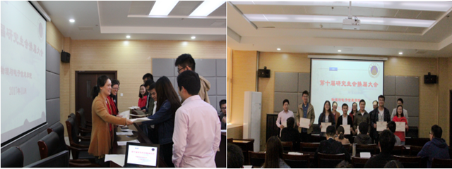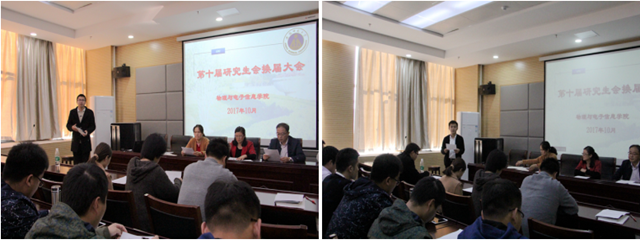研究生会成员名单,对新当选的研会委员表示祝贺。第十届研会主席李子旻代表新一届研会作下一学年研会汇报工作计划,表示要不负众望勇立潮头,继往开来开拓创新。在掌声中,参会老师给新当选的研会学生干部颁发聘书,并合影留念。
