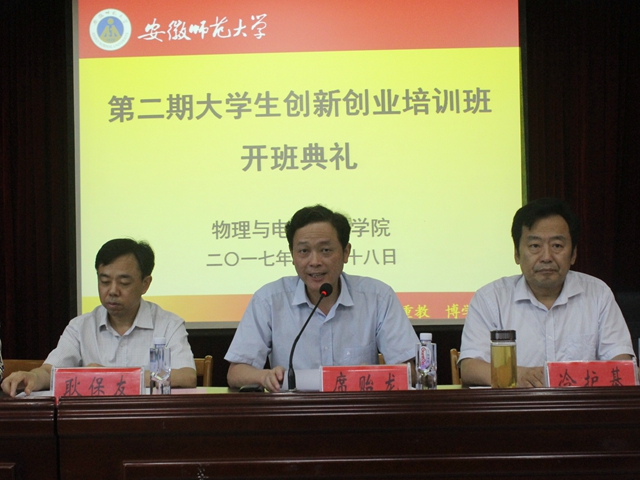 在赭山校区图书馆报告厅隆重举行第二期大学生创新创业培训班开班典礼。安徽工业大学工程实践与创新教育中心主任、中国创造学会副理事长冷护基、安徽师范大学教务处处长席贻龙、科研处副处长耿保友、学院党委书记李娟、院长崔执凤,第二期培训班全体学员、学生科技创新骨干等出席了开班典礼,典礼由学院党委副书记吴长义主持。