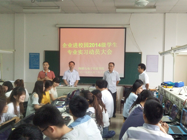 学院于6月28日上午组织了2014级学生专业实习动员大会。参加动员大会的有学院教学副院长崔光磊、党委副书记吴长义、工科实训中心主任蔺玉柱、2014级本科生辅导员、合肥求精公司和上海蓝鸥科技有限公司的工程师以及参加实训的全体学生。
