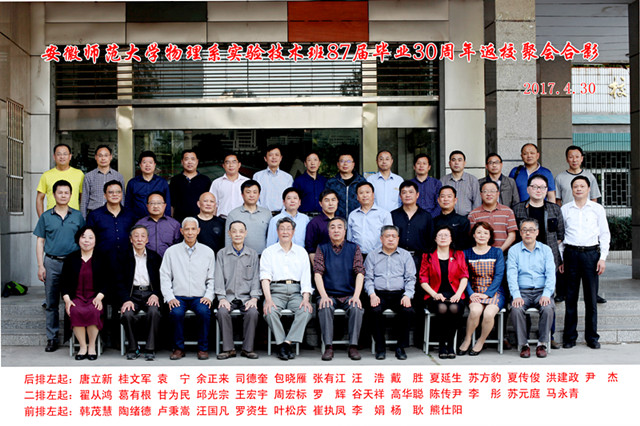 物理系实验技术专业87届校友毕业30周年返校座谈会在综合楼三楼大会议室举行。院党委书记李娟、院长崔执凤,教师代表陶绪德、卢秉嵩、汪国凡、罗资生、叶松庆、杨荣梅及返校的32名同学参加了此次会议,会议由87届校友、我校环境科学与工程学院行政副院长甘为民主持。