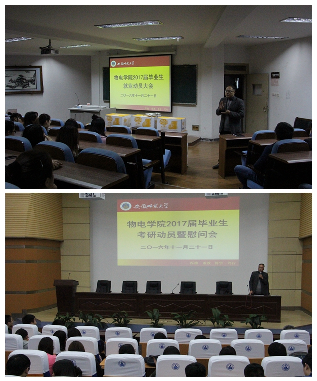 分别在赭山校区科技小礼堂和综合楼三楼大会议室召开了“考研再动员大会”和“就业学生动员会”,分类别指导帮扶学生。学院院长崔执凤、院党委书记李娟、院党委副书记吴长义、毕业班辅导员以及全体毕业生出席了会议。