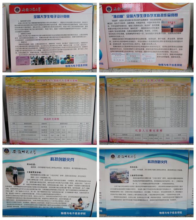 本次学生科技作品展演共分为展板展示区、机器人大赛作品演示区、“创客”大赛作品演示区、全国大学生智能车竞赛作品演示区和电子设计大赛作品演示区等五个展区。展板展示区详细讲述了各类专业比赛概况、历年竞赛成绩统计以及优秀学生代表。作品演示区安排专业教师以及获奖学生进行现场讲解。参观过程中,在2016年安徽省大学生电子设计杯荣获一等奖的作品——风力悬浮控制装置,给在场的每一位同学留下深刻的印象。“哇,学长学姐们真厉害”参观过程中类似于这样的声音在新生队列里不时发出。在2016年全国大学生智能车大赛中获得国家级奖项的小车驰骋赛道上,利用电磁感应“自主探路智能车”、双车轮“直立行走智车”等作品逐一登场,吸引了大量的目光,当看到小车按指令沿赛道正确寻迹时,大家不由得发出赞叹声,纷纷上前询问:“做科技制作难不难?没有基础能不能做?该从何处下手?”老师都耐心细致地一一作答,并鼓励在场同学树立信心,先学好基础课程,培养专业兴趣,为后续实验课程准备条件。随后,通过手机APP就可以控制的“智能指纹密码锁”、根据程序就变换10种形状的“小蛮腰灯塔”等科技作品一一展出。作品展示活动迎来了大量的参观同学,从他们的眼神中看出对展示作品的好奇及强烈的求知欲。同学们纷纷走向自己感兴趣的展台,主动与作品作者交流,一时间,整个大厅成为了一个交流知识与经验的宽广平台。