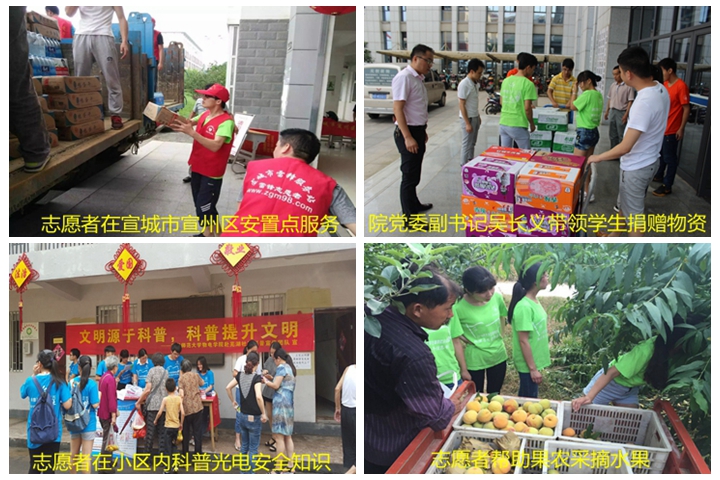 党委副书记吴长义及辅导员带领下赶赴芜湖县捐赠募捐的物资。在部分社区,物电学子利用专业技术,为受灾群众免费检测和维修进水家电,同时把光电知识带进社区,举办生活常识惠民生的科普知识宣讲活动,讲解光电知识和生活小常识,并做了相关的光电实验。在安徽砀山,团队成员不畏高温酷暑、不怕蚊虫叮咬、顶着烈日在田间采摘,帮助果农们采摘水果。