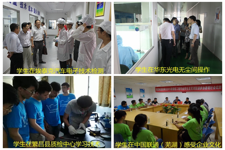 企业一线练真功,专业实践见本领。学院结合工科专业特点,顶层设计,把暑期社会实践作为工科学生强化职业素养、培养专业技能的重要课堂。其中,4个工科专业、617位工科学子到生产一线,参与生产、质检和研发等各个生产环节,练就真功。在中航华东光电,实践队员在无尘车间体验了军工LED的生产流程。在埃泰克汽车电子公司,工程师们教会了大家C201射频模块,在宣城市铭威机械有限公司队员们感受了“冷机器”的85Tube。在芜湖联通,实践队员深度体验了联通技术。