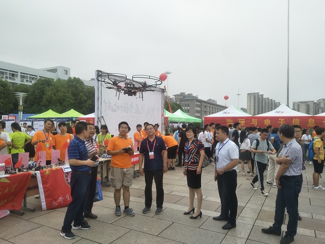 在敬文图书馆前广场举办迎新生科技创新作品展,成为迎新现场一道特别的风景线。
