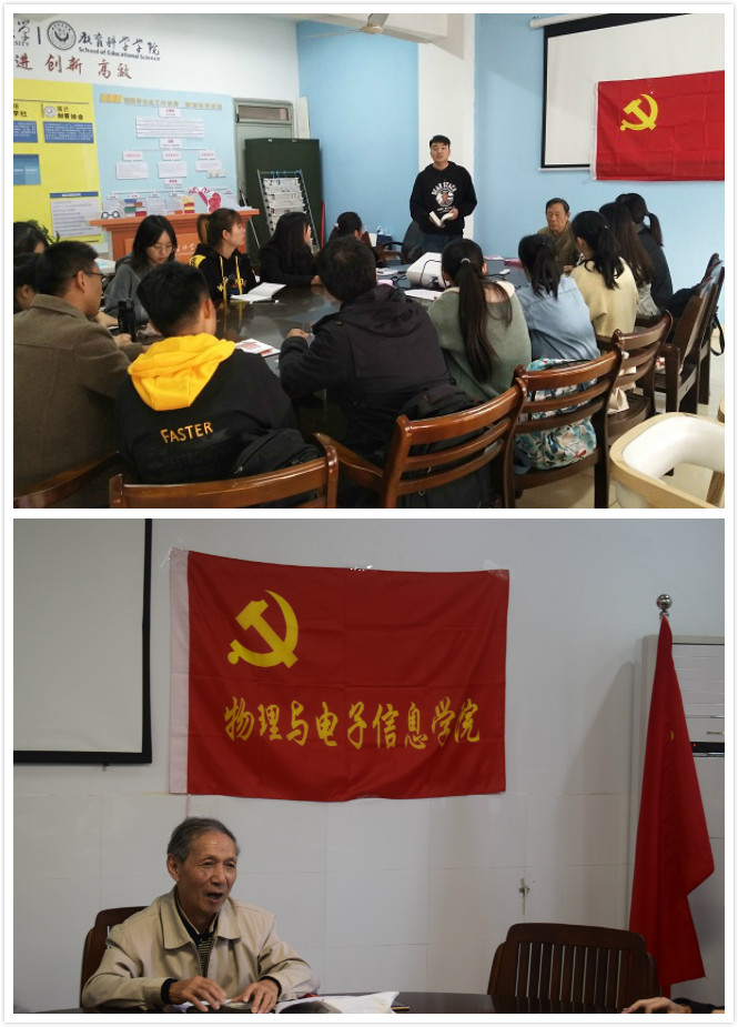 11月9日下午,傅思欣老师带领物理支部的全体学员以“共产党人的初心使命”为题,从习近平总书记在新中国成立70周年上的讲话出发,探究新时代的共产党人面临的新困难和新挑战,他强调,在“不忘初心、牢记使命”的学习过程中,要把爱党、爱国、爱社会主义联合起来,为实现“三步走”战略而努力奋斗。他告诫学生:“我们不能只学习一阵子,也不能只实践一下子,要终身学习。”