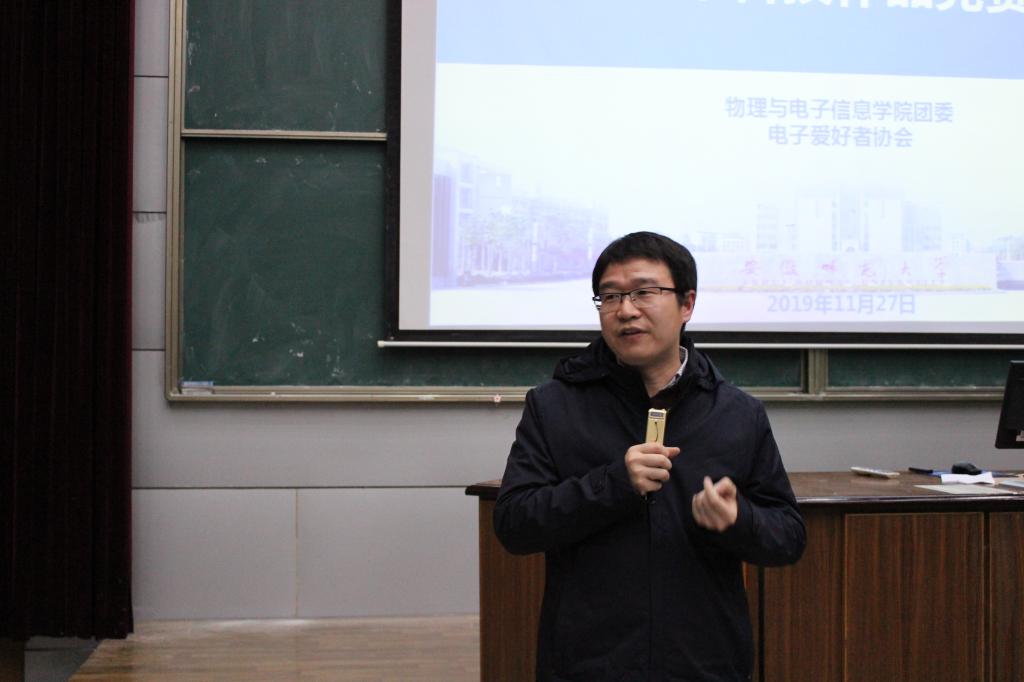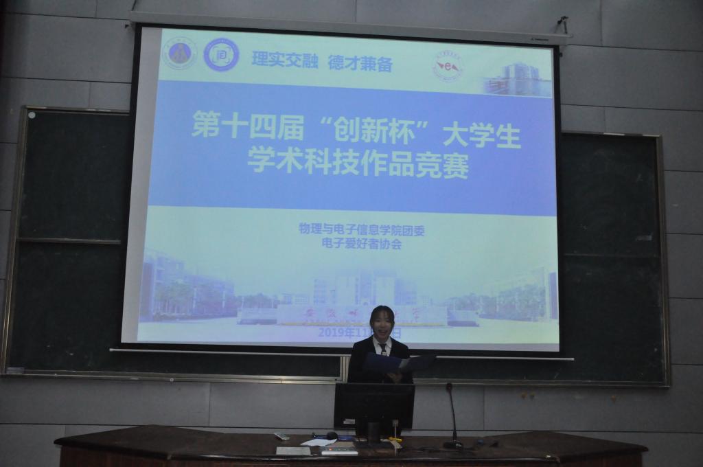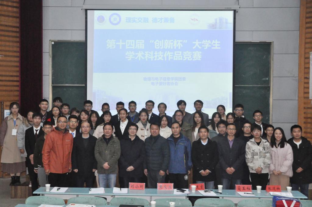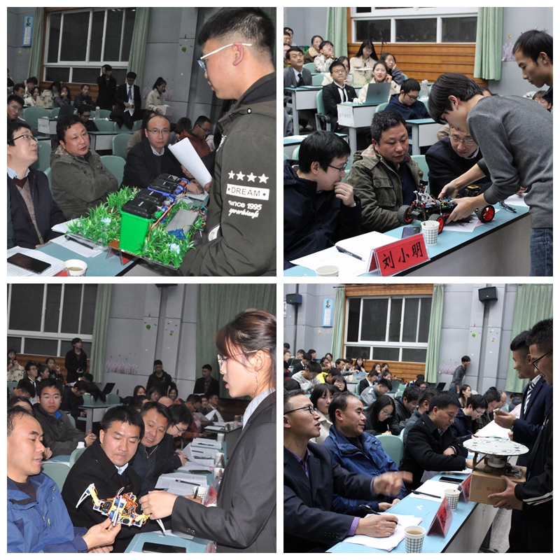 团委与电子爱好者协会共同举办的第十四届“创新杯”大学生学术科技作品竞赛在教学楼2010105如期举行。学院党委副书记黄友生、电子专业负责人刘小明、工科实训中心主任蔺玉柱、专业教师陶文海、冯友宏、葛有根、甘露、张道秧,院团委书记宋凤楼出席本次比赛并担任评委,参赛学生及亲友团共200余人参加现场活动。