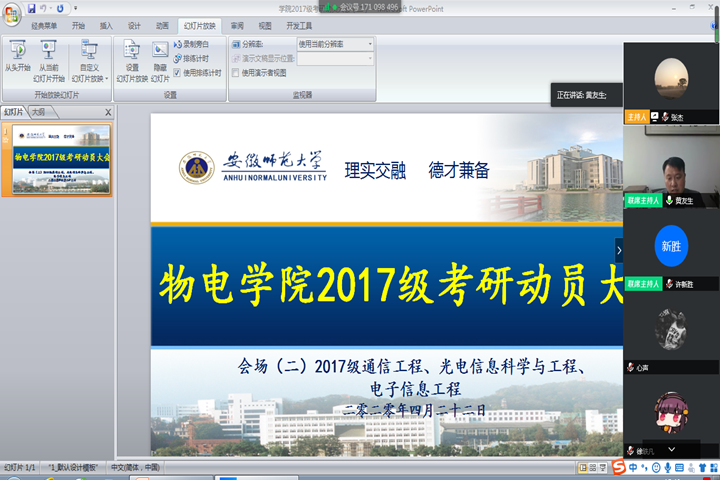 2017级学生考研动员大会在腾讯会议平台上举行。党委副书记黄友生、教学副院长许新胜、17级辅导员老师以及17级全体本科生参会,同时邀请了两位16级考研优秀学生代表进行经验交流。会议分别由辅导员张杰、李琦琦主持。