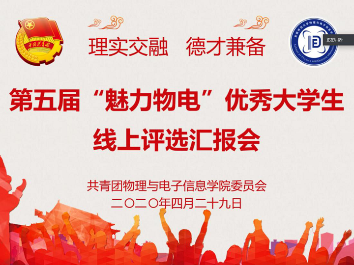 先进评选展风采。4月29日,学院举办第五届“魅力物电”优秀大学生线上评选展示活动。经过个人申报、班级推荐、学院初审,29位优秀代表入围学院评选。会上,各个汇报选手从专业学习、学科竞赛、志愿服务、社会实践等方面分享自己的奋斗历程和成长轨迹。他们用朴实的语言诉说进入师大后一路走来的沿途“风景”以及诸多荣誉背后的坚持与汗水,展现了物电学子“开拓创新、拼搏进取”的精神风貌,传递了挑战自我、追求卓越的青春正能量。