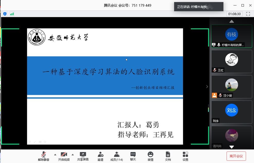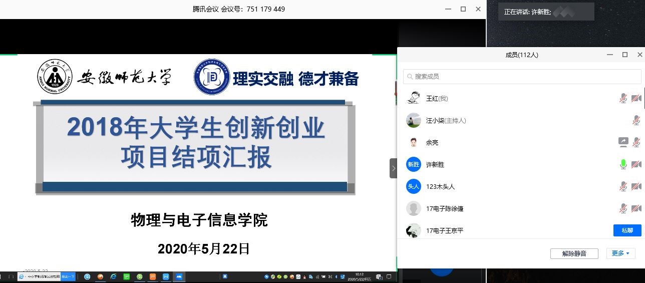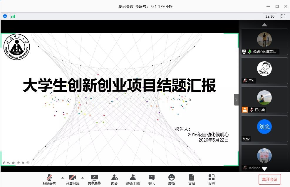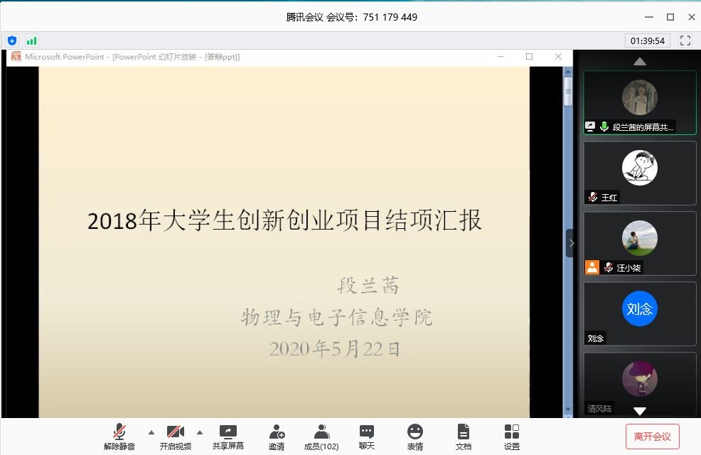 通过腾讯会议举办2018年大学生创新创业项目结项验收的线上汇报工作。教务处实践科程啸天老师、电子信息工程专业刘小明教授、电子信息工程专业陈卫松副教授、光电信息科学与工程专业李宽国副教授担任评委。学院教学院长许新胜参加汇报会,汇报会由学院教学秘书汪光麒主持。