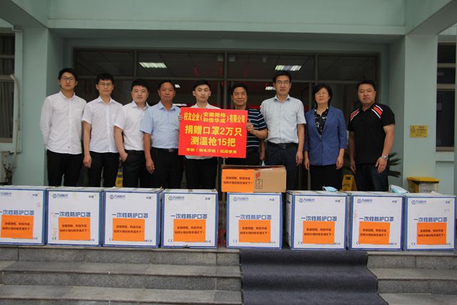 许晨晨)感恩母校,爱心回馈。6月5日下午,我校物电学院2016届电子信息工程专业叶杨根代表安徽微格生产力促进有限公司、北京和新华成知识产权事务所向母校捐赠2万只口罩和15把测温枪。安徽微格有限责任公司执行董事兼总经理叶杨根、技术部总监杨应明、市场部总监高陈皓,学校社会合作处(校友工作办公室)处长(主任)李裕鑫、校防控办负责人邵登辉、85Tube