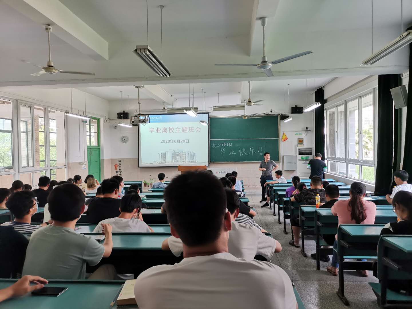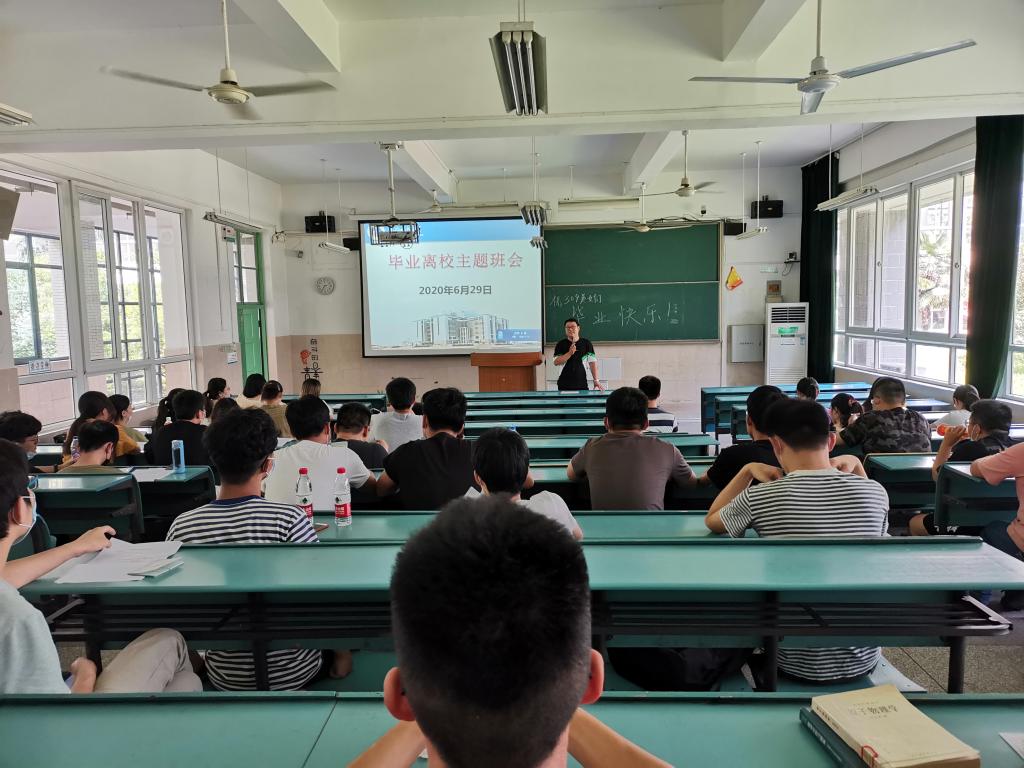 2020届全体毕业生在教学楼五个教室分专业召开毕业生文明离校主题班会。毕业班辅导员汪光麒、米佳佳、宋凤楼祝贺同学们顺利完成四年学业,深情回顾了同学们的大学四年,并对大家四年时间对学校学院和辅导员工作的支持表示感谢。三位辅导员分别介绍了毕业生文明离校的有关要求和工作安排,并叮嘱同学们要模范遵守校规校纪,文明离校,以实际行动为母校留下完美印象、为低年级同学留下学习榜样、为自己留下美好回忆。