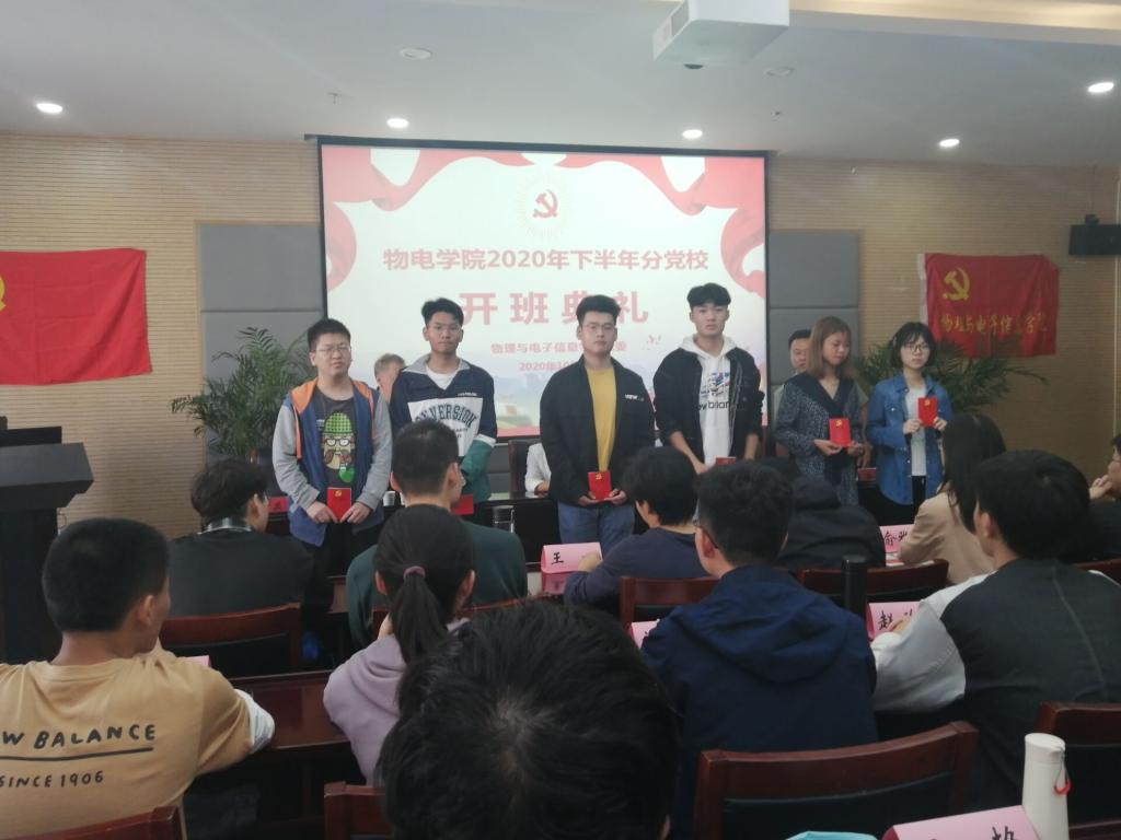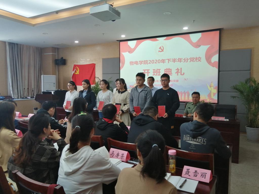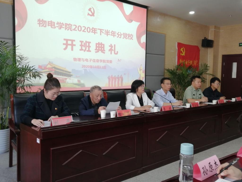 2020年下半年分党校培训班开班仪式在物理楼304会议室召开。校党委常委、组织部部长季爱新,院党委书记、分党校校长李娟,院党委副书记、分党校副校长黄友生,院关工委副主任、分党校指导老师陶绪德,培训班副班主任邹孝龙参加了开班典礼。典礼由培训班班主任刘燕主持。