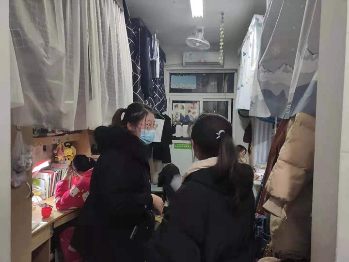 学院定期组织开展学生宿舍安全卫生检查,每周通报检查结果进行官网公示,限期整改。12月24日晚22:30,学院党委副书记黄友生带领全体辅导员深入学生宿舍,对宿舍安全隐患、寝室卫生、学生晚归情况等进行专项突击检查,重点检查是否存在晚归不归和使用违规电器等行为。针对部分宿舍卫生差、有杂物堆放的情况,督导学生立即整改、务实高效。同时临近期末,老师们叮嘱学生有计划、有准备地复习,严格遵守考试纪律。
