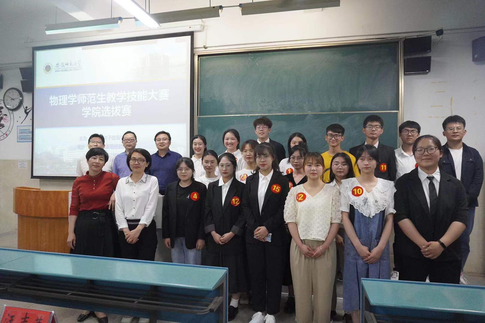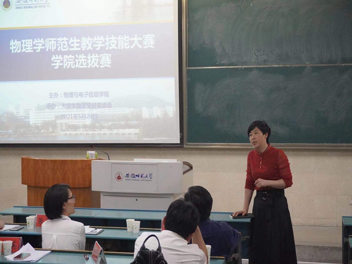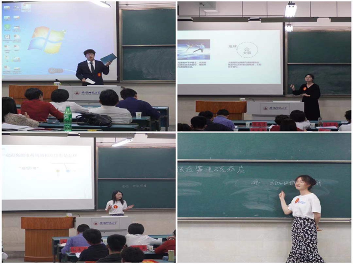 主办,大学生物理爱好者协会承办的物理学师范生教学技能大赛于5月24日晚7点在教学楼2010405教室举办。学院教学副院长张爱清,物理教师教育研究室主任汪志荣,专业教师王长江、姚关心、高爱英,物协指导教师邹孝龙担任此次大赛的评委。比赛由物协副会长程思维主持。