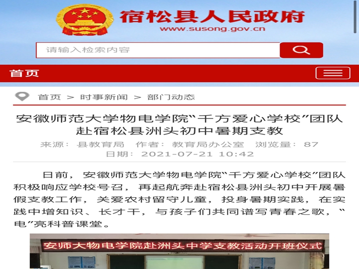 本网讯(千方爱心学校赴洲头中学支教团队)7月13日上午,安徽师范大学85Tube “千方爱心学校”赴宿松县洲头初中2021年暑期社会实践活动再起航。