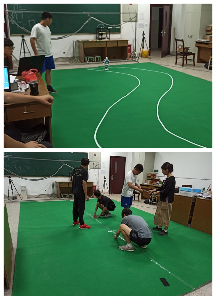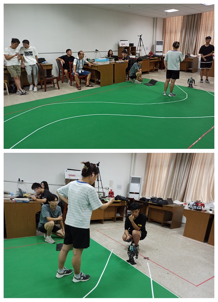 在赛前准备阶段,在全院范围内选拔队员,组成了四支比赛小组,参加仿人机器人短跑和舞蹈机器人两个项目。短跑机器人利用头部的视觉传感器,通过算法将收集到的图像进行灰度处理,由于不同颜色的灰度值不同,从而准确识别白色跑道,再利用大津算法使观察到的白线始终处于机器人的视野中央,从而达到巡线的目的。仿人机器人多人舞蹈比赛要求至少两个机器人在规定时间内配合音乐完成一套完整的机器人舞蹈。舞蹈具有很强的观赏性,参加比赛的机器人应该能够像人类一样做出复杂而且灵活的动作。比赛考验多个机器人在舞蹈中对动作的复杂性与艺术性及动作与音乐的配合,并考核多个机器人之间的配合以及相互间的通信。师生们共同制定切实可行的方案,经过采购元器件和组装机器人的阶段,随即开始对机器人进行编程和调试。经历了近百天的准备,四组六个机器人整装待发,以待比赛。