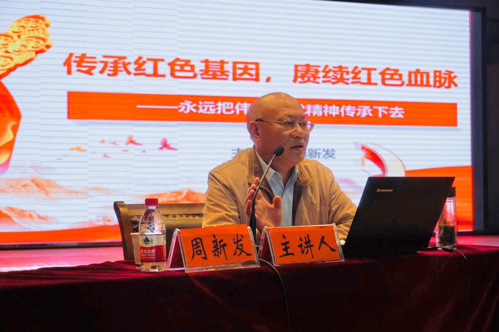 周新发以“传承红色基因,赓续红色血脉”为主题,结合自身的学习和体会阐述了伟大建党精神的理论来源及实践基础、文化土壤、深刻内涵,强调伟大建党精神是中国共产党人精神谱系的“源头活水”、“一根红线”和鲜亮底色。周新发指出新时代的青年大学生传承伟大建党精神,要筑牢“一心向党”的政治忠诚,要坚定“一诺千金”的理想信念,要厚植“一叶知秋”的为民情怀,要强化“一马当先”的责任担当,要增强“一决胜负”的斗争本领,要永葆“一往无前”的奋斗姿态,要锤炼“一身正气”的品德修为。