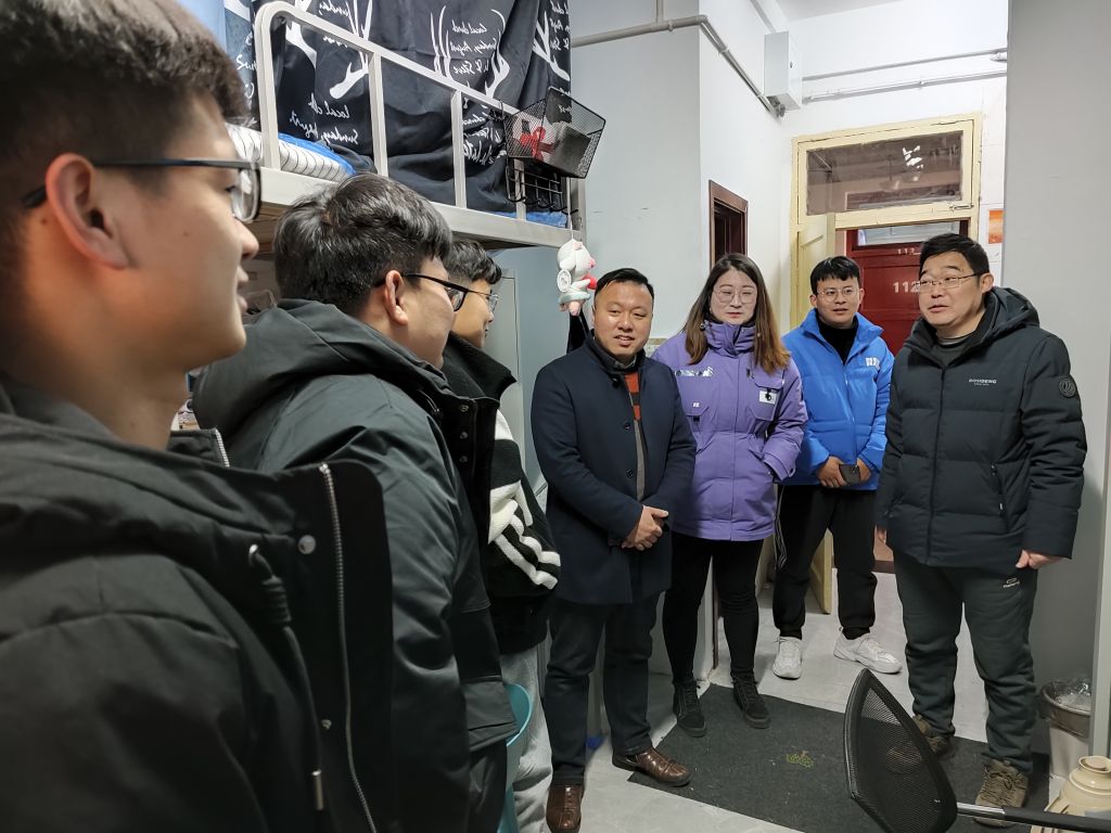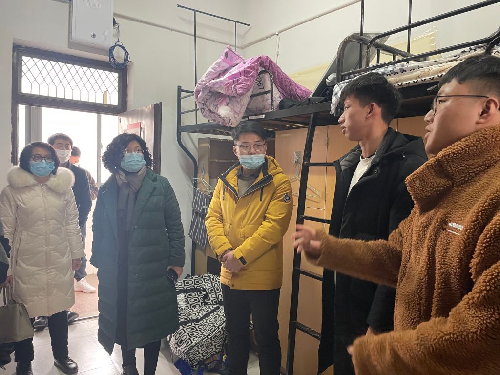 走访过程中,学生们主动与领导老师交流自己的寒假学习生活状况。院党委书记李娟耐心询问毕业班学生的就业选择和考研情况,勉励同学们在新学期保持良好心态,积极准备就业和复试,争取获得满意的工作或考取理想的大学。院长郑贤锋告诫低年级的同学,要尽快“收心”,投入新学期学生生活,做一个勤奋学习、积极向上的新时代大学生。老师们还特别关注外省返校同学旅途疫情防护和核酸检测结果,提醒学子们“非必要不出校”、“非必要不离芜”,督促辅导员密切关心关注未返校学子。每到一处,领导老师们还重点排查教室、宿舍安全隐患,倡导大家打造安全整洁的学习生活环境。