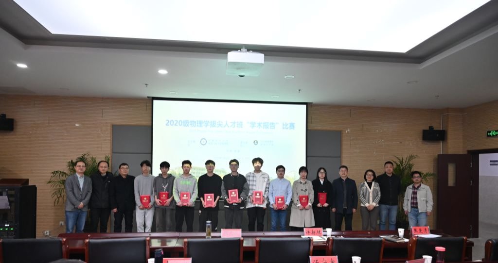 物理拔尖班“学术报告”比赛在物理楼304会议室成功举行。院党委书记李娟、教务处副处长崔光磊、科研处副处长许新胜、院科研副院长宁利新、院党委副书记黄友生、院教学副院长张爱清以及专业教师张先燚、黄守芳、卢宁、汤宁宇担任评委。2020和2021级物理拔尖班全体同学观摩了本次比赛。比赛由物理学拔尖班班主任盛晓伟老师和2020级首届物理学拔尖班刘玥同学共同主持。