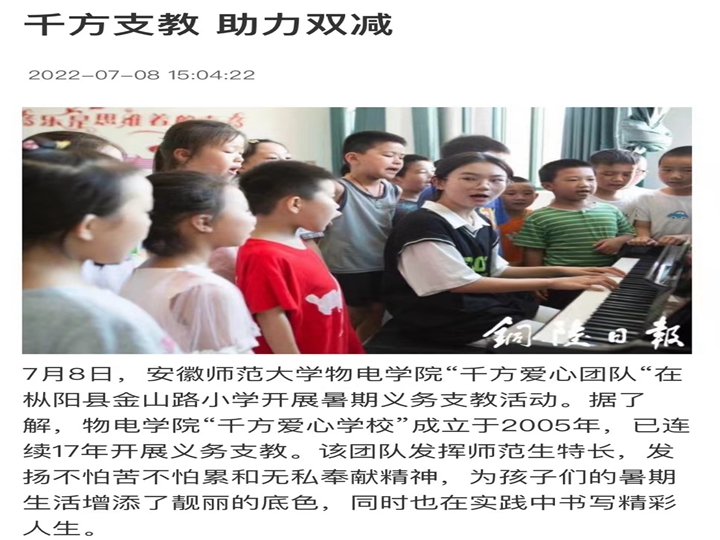 (“千方爱心学校”赴枞阳爱心支教团队)7月8日,安徽新闻网、铜陵日报相继报道安徽师范大学“千方爱心学校”赴枞阳县金山路小学爱心支教活动。