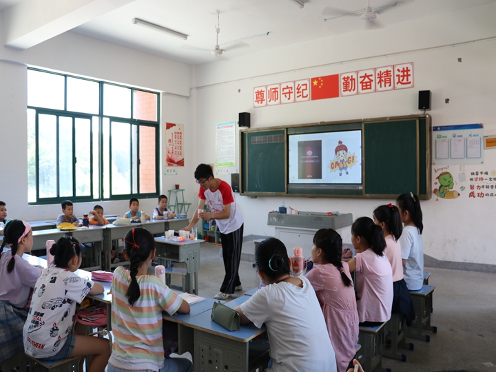 “金苹果”科普课堂,让科学走近你。调研慰问组走进支教队员们的课堂,观摩科普小实验。来自2020级物理学(师范)专业的沈立行以《科普小课堂之浮力的秘密》为主题,正通过把球分别放进盐水和纯水里面,让孩子们生动形象的理解了浮力和密度的关系。将物理与生活现象相结合,激发了孩子们对于科学的兴趣。