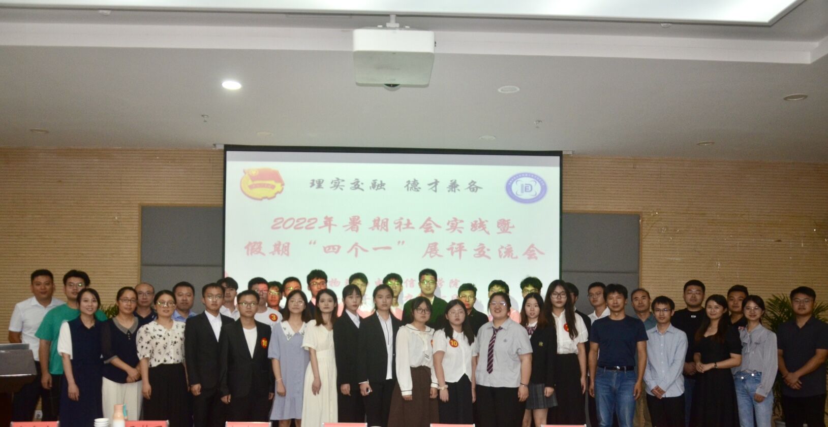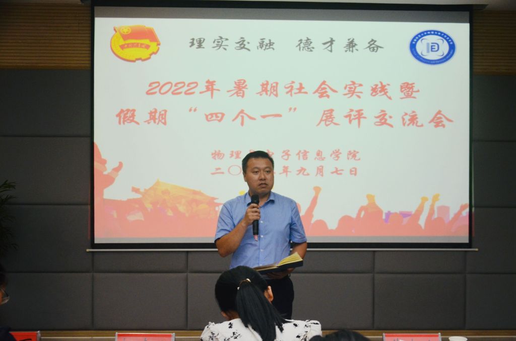 在物电楼304会议室举办2022年假期“四个一”暨暑期社会实践团队展评交流会。学院党委副书记黄友生,暑期社会实践思政指导教师、马克思主义学院丁建文老师,学院5个专业教师代表,院团委书记刘冠琪、副书记甘露,学院全体专兼职辅导员参加会议。2020级、2021级部分实践团队代表和学生代表到场参会观摩学习,2022级新生线上观看评比交流会。展评会由辅导员张津源主持。