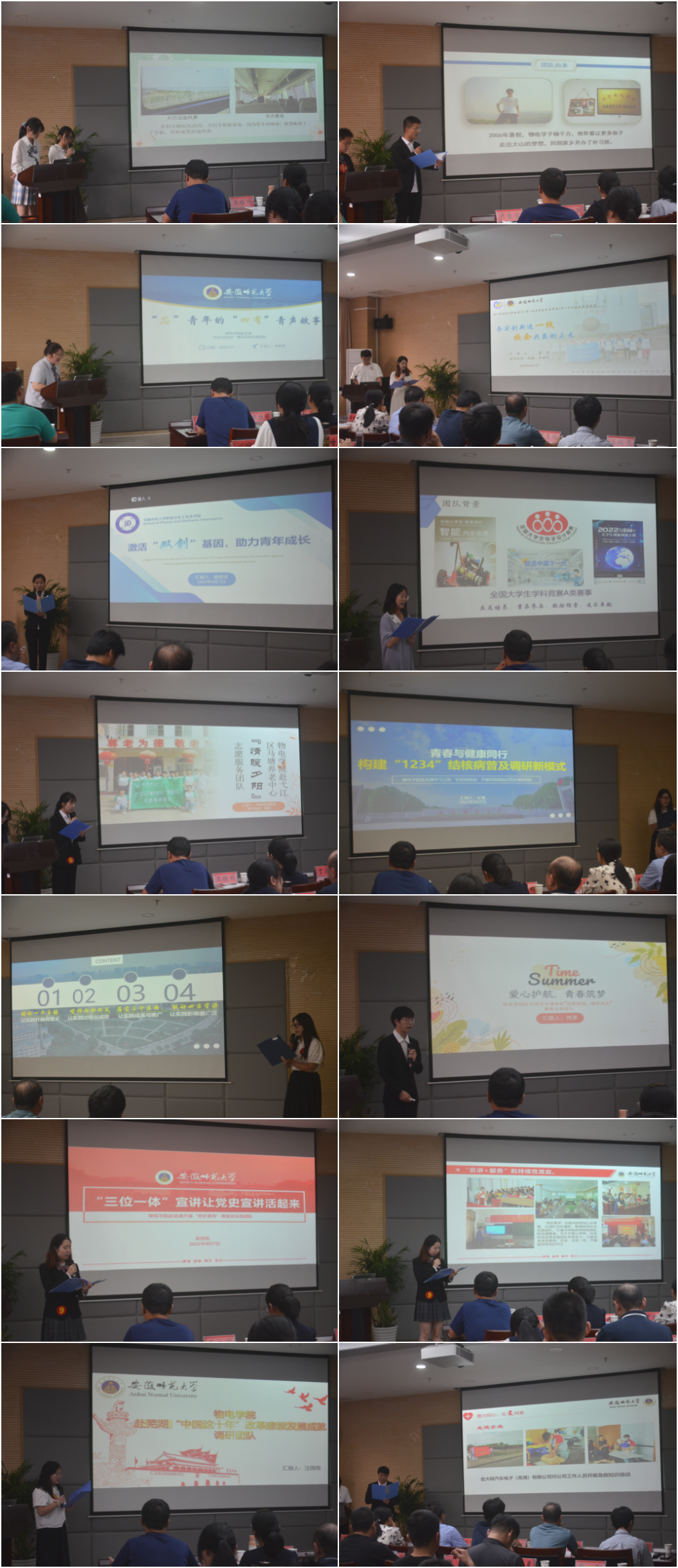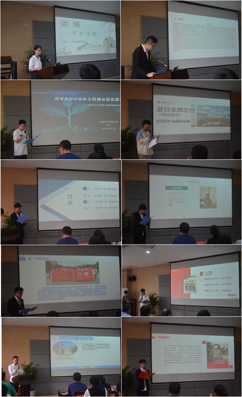 14支暑期社会实践团队负责人分别从实践准备、实践实施、实践成效、实践反思等方面介绍了团队的实践过程和感人故事。他们中有结合专业特色开展志愿服务的社区科技站团队;有传承红色基因,深挖科技党史故事,与多个团队合作宣讲的“党史青传”微宣讲实践团队;有扎根基层,利用专业优势连续十八年参与乡村支教,为乡村教育振兴添砖加瓦的“千方爱心”学校;也有深入企业一线,结合专业所学进行实干操作的高新技术企业见习团队;更有以赛促学、以赛促练、以赛促能为的学科竞赛集训团队。所有的实践活动和项目都用实际行动向外界诠释着师大学子自强不息、知行合一、甘于奉献的优良品质。现场气氛热烈、掌声不断。