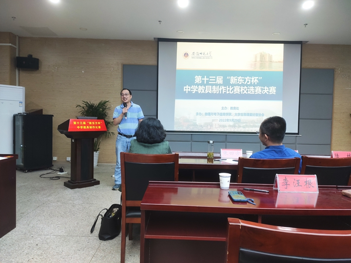 李汪根作总结点评。他指出,本次比赛是对基础教育振兴计划的大力支持,在各方的努力下,“新东方杯”中学教具制作比赛呈现蓬勃向上发展的趋势,并对参加决赛的同学们表示热烈的祝贺。他表示,学校一直以来十分重视对学生创新思维能力的培养,希望同学们在制作教具中锻炼动手能力、提高创新思维、提升学科素养、振兴基础教育。