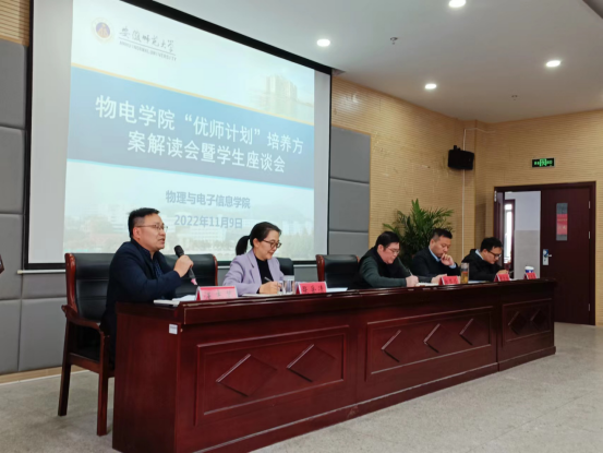 吕建平从培养目标、各模块课程设置和特色培养内容等方面解读了学院“优师计划”培养方案。汪志荣以师范生技能提升为主题,从夯实专业知识基础、提升教书育人能力、强化教育实践锻炼等方面为同学们作了辅导。黄友生从什么是“优师计划”、为什么要实施“优师计划”以及如何才能成长为一名优师等方面深度解读了相关政策文件精神。他强调“优师计划”是落实科教兴国战略的重要举措,是一项伟大的事业、神圣的职业和可期的功业,希望同学们珍惜机遇,勤学苦练,努力成为乡村教育振兴的“大先生”。会上,同学们纷纷表达了自己的想法、疑惑和建议,与会领导老师逐一进行了解答交流。