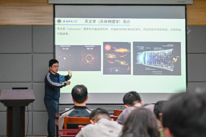 之后,杨磊作题为《X射线辐射准周期爆发活动星系核的射电辐射特征》的报告。报告中,他从多波段的天文观测设备入手,介绍了多信使天文学的发展历史以及天文领域当前最新的科学成果,着重介绍了X射线辐射对准周期爆发活动星系核的射电辐射特征,带领同学们进行了一场探索宇宙奥秘的科学之旅。科普之余,杨磊还为学弟学妹们传授了一些做科研的经验和技巧,同学们反响热烈。