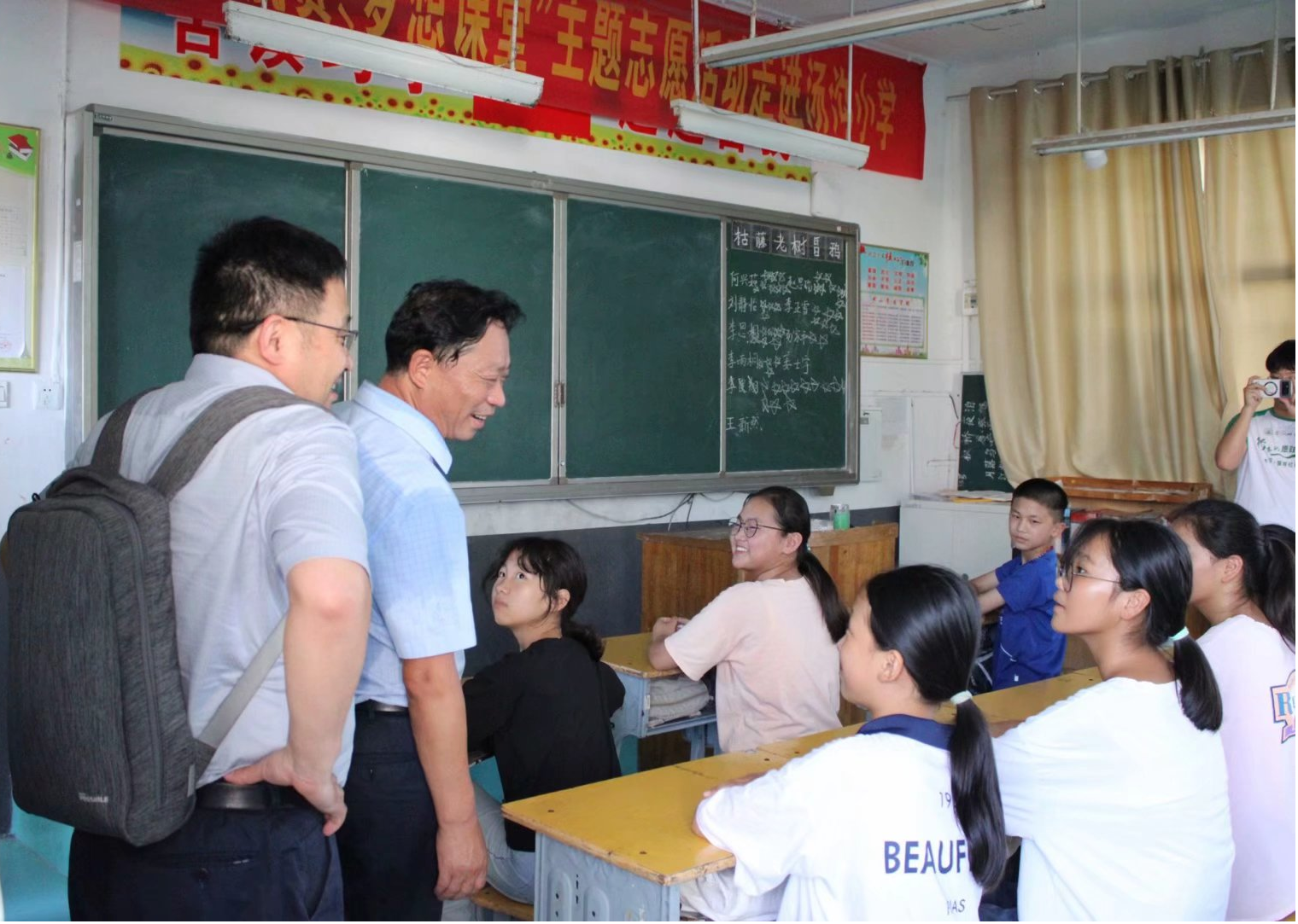 在六安孙岗村文明实践站,院党委副书记黄友生一行参观了小学部、初中部的教学开展情况,同时听取了一堂物理教学课。他对团队的课程种类安排表示高度赞许,对团队成员的成长感到十分欣慰,他强调,暑期社会实践是大学生开阔视野的窗口和提升个人专业素质的重要途径,希望支教队员能够认真对待本次实践活动,在实践期间注重言行举止,树立师大人的榜样模范形象。