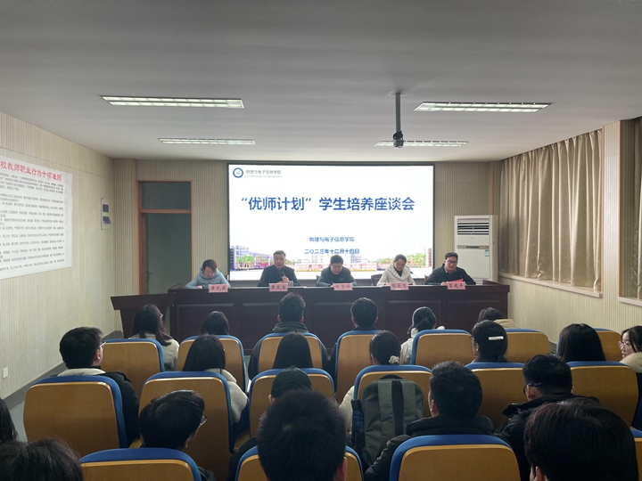 组织召开了“优师计划”学生培养座谈会。学院院长郑贤锋、院党委副书记黄友生、物理学专业负责人吕建平、2022级“优师计划”班班主任黄武英,“优师计划”辅导员刘冠琪、刘敏、邹孝龙,2021级、2022级、2023级物理学“优师计划”全体学生参会。会议由学院教学副院长张爱清主持。