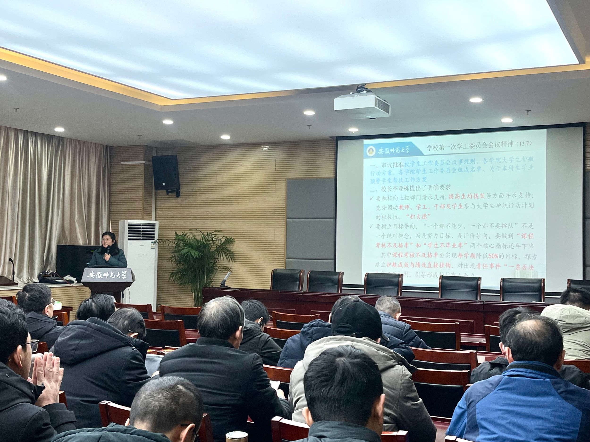李娟领学了习近平总书记主持召开深入推进长三角一体化发展座谈会时发表的重要讲话和中央经济工作会议精神。与会人员观看新闻视频,集中学习了省委书记韩俊在安徽师范大学调研时的重要讲话,李娟介绍了韩俊来校调研情况,指出要贯彻落实韩俊书记关于“落实立德树人根本任务,推动高等教育内涵式高质量发展”等重要讲话精神。李娟还详细传达了学校第一次学工委员会会议精神,就落实学院大学生护航行动计划工作作了布置。会议还就近期重点工作作了专题部署。