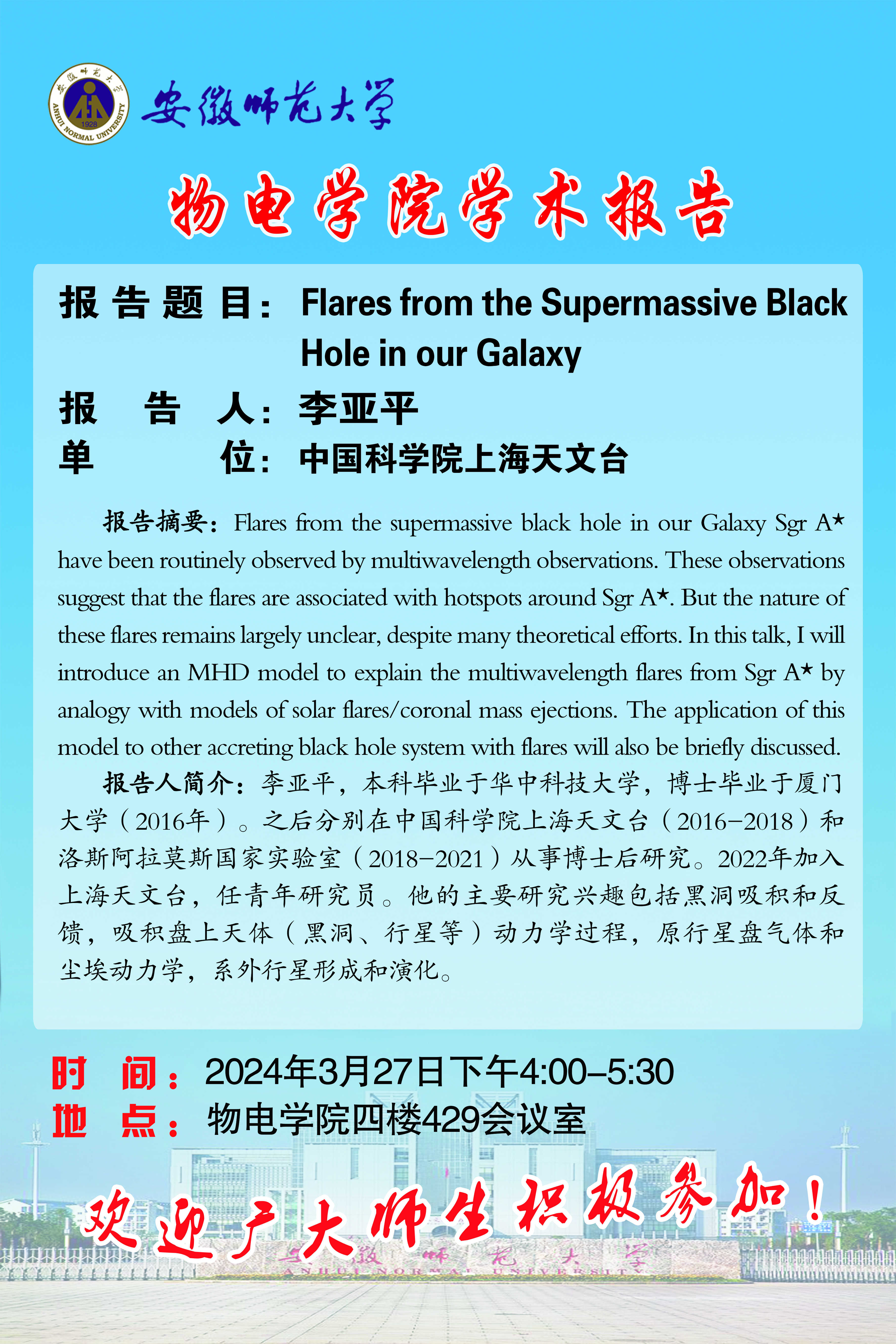 【学术预告】物电讲坛第7期:Flares from the Supermassive Black Hole in our Galaxy