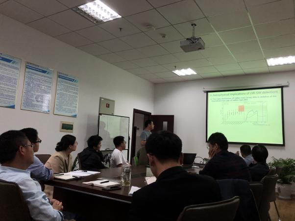 在报告会上,朱良贵博士简要介绍了引力波的研究背景及意义。引力波起源于引力场的四极辐射,能探测到的引力波信号主要来源于致密双星的的旋进和并合。引力波是探测低电磁亮度的致密天体(如双黑洞)的优异信使。且引力波探测允许直接测量引力波源的光度距离而不需要宇宙距离阶梯的校准,使得引力波可以作为“标准汽笛”独立地推断宇宙的膨胀历史。传统的电磁波信使巡天提供了比较完备的AGN和星系的星表,这为结合引力波事件星表和AGN星表/星系星表推断引力波源的形成环境以及宇宙膨胀历史提供了良好的数据条件。报告会上,朱良贵博士同与会师生分享了本人及所在团队近年来对传统的星系和AGN巡天对新兴的引力波天文学研究,即:如何结合引力波探测和AGN巡天推断引力波源的形成环境;如何结合引力波探测和星系星表独立地推断宇宙的膨胀历史;利用引力波探测推断宇宙的膨胀历史时可能存在的系统偏差。报告会结束后,与会师生和朱良贵博士就相关问题展开了热烈的讨论和交流。